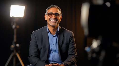 top-down photograph of indian-american man on couch, laptop, notebooks, paperwork, files, photos, busy focused man, night time, cinematic colorful lighting --ar 16:9