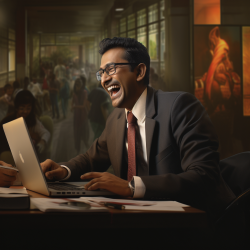 Indian banker sitting on his desk in a bank working happily on his laptop, photoreal, realistic --v 5.2