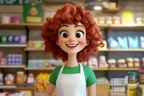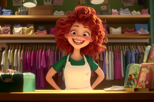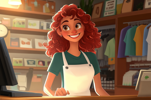 A cartoon character, with curly red hair, brown eyes and wrinkles, wearing a white apron over a green t-shirt, smiling happily with shining eyes, standing behind the counter of her store of clothes, with shelves full of clothes in the background and a lot of costumers --ar 3:2 --s 50