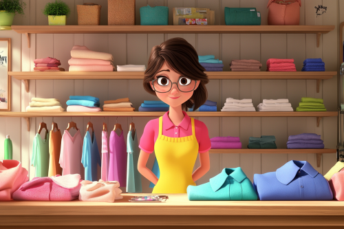 A cartoon character, with with clients standing behind the counter of her store of clothes, with shelves full of clothes in the background with clients and a lot of costumers --ar 3:2 --s 50