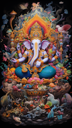 an indian colorfull complex thangka art work with ganesha sitting on top and gods and spirits --ar 9:16