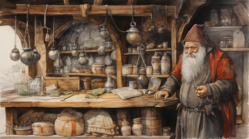 highly stylized pen and ink drawing with watercolor wash medieval shopkeeper in his store selling general supplies --ar 16:9