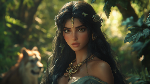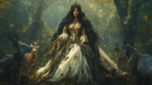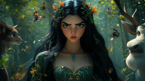 jasmin disney princess but as a human druid, wearing forest themed ballgown, long beautiful black hair, angry expression, surrounded by woodland animals, octane render, soft lighting, --ar 16:9