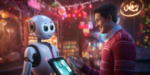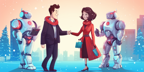 a friendly robot and a female software developer in a vibrant joyful winter holiday scene hand shaking --ar 64:32