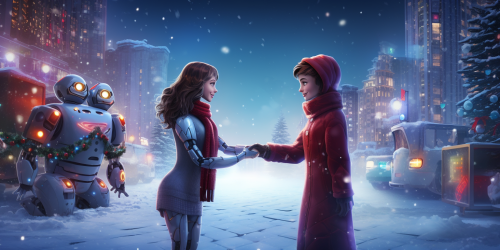 a friendly robot and a female software developer shaking hands calling a truce. in a vibrant joyful winter holiday scene with space around them --ar 64:32