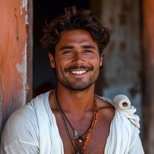 realistic movie still of a young woman with short blonde hair, blue eyes, and tan skin in a loose grecian inspired white gown facing a muscular man of pubjabi heritage with black hair and a strong facewho is wearing a white shirt and brown pants, medieval tropical palace setting --s 250