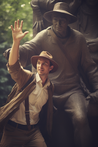 retro vintage photo of a indiana jones style man reaches out for a statue --ar 2:3 --s 50