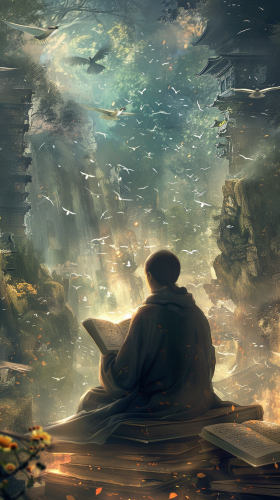 Create an image representing a spiritual guide teaching Gnostic theology, with a scholar presenting a sacred text to a group of students in a serene, mystical environment. The teacher is portrayed as a wise traveler, symbolizing Andrea Bertolini’s worldwide spiritual journey. Surround him with ancient scrolls, books, and symbols from different traditions like Buddhism, Zen, and Western esotericism. The setting should evoke an atmosphere of deep learning and spiritual enlightenment, with soft lighting and a sense of historical wisdom, --ar 9:16 --v 6.0