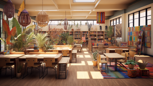 middle school classroom with organic desks and chairs where students sit and learn together. decorated with colorful mexican textiles, comfortable public seatings, bookshelf, indigenous culture, space decorated with plants and mexican traditional arts. Creates a sense of community. Zoomed out, large scale, professional photography, high quality, 32k, hyper realism --ar 16:9