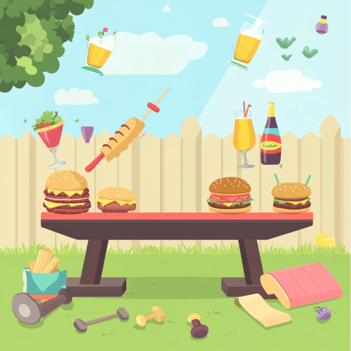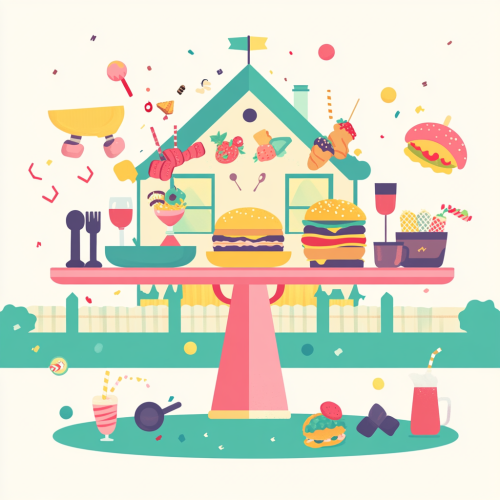 A symmetrical children see-saw with one seat on one side loaded for health ( healthy food, exercise mats, dumbbells, etc.) and the seat on other other side loaded with indulgences( holding burgers, hot dogs, ice-cream, cocktails, wine glass, party hats, etc.); done in vector style and bright pastel colors; background is outdoor backyard.