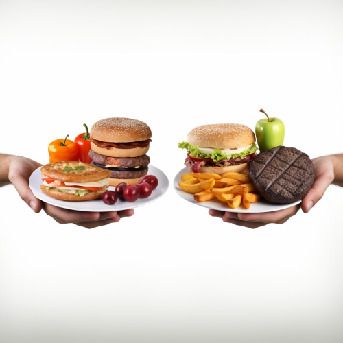make an image of people holding two plates and comparing them, one plate must contain exclusively vegetables, fruits and vegetables and the other plate must contain exclusively bad foods such as hamburgers, fries, sweets, with a white background