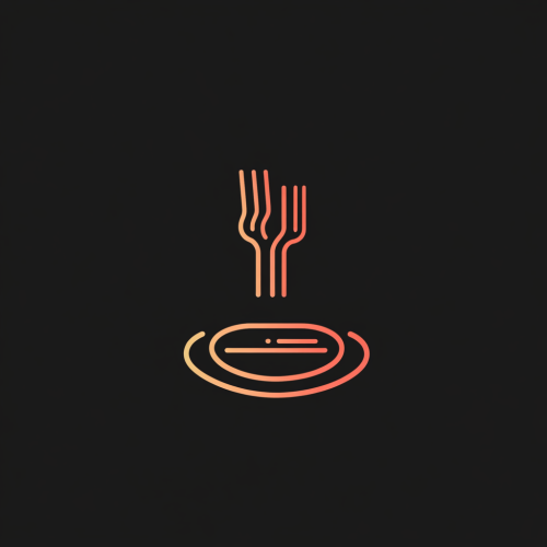 a minimalistic logo design with a fork on the left and a knife on the right. A plate on the center with small heat waves in the middle, representing vapor. Make it like is looked from aboce