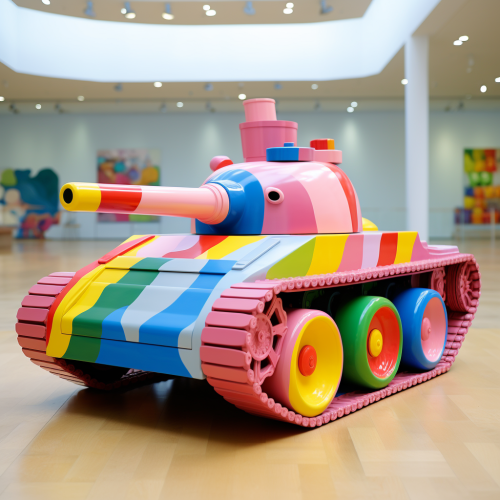 A tank reimagined as life-size but styled as if they are made from colorful toy plastic. Solid, vibrant colors with a glossy finish or slightly textured finish. Realistic but with the chunky simplicity of children's toy designs. It should be set against a realistic background that contrast with their playful, toy-like appearance to highlight the blend of real-world settings with the whimsical, plastic toy aesthetic