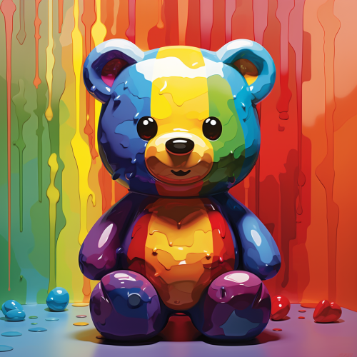 fluid paint style , 5 light sharp coloured background , with plastic glossy toy bear standing completely covered by red green blue yellow and purple fluid painting colour