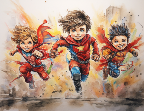 Children's sketch in the style of Sandi Sonke of child-superheroes in action --ar 22:17