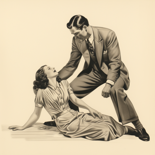drawing, man laying on back injured with a woman standing and crying above him, 1930's clothing, background obscured