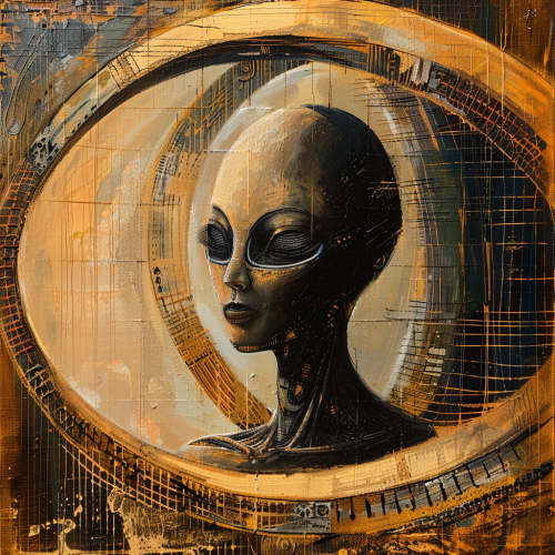 modern day female engineer working on a model while nostradamus looks over her shoulder --ar 16:9 --v 6.0