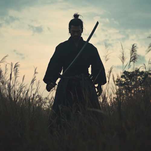 samurai Jack standing in the middle of a field with his hand about to draw his sword that's in his sheath, he's facing the camera, shot on a sony alpha a1, live action version, 4k