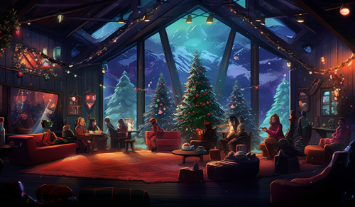 colorful festive holiday party inside a high-tech, cozy cabin with 30 year old humans and AI articulate robots --ar 31:18