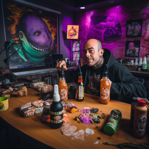 Inside a modern podcast studio with moody lighting.
