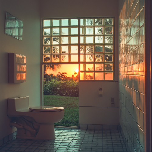 80’s sunset villa with block glass windows inside of the bathroom the bathroom is spacious with a toilet and a bathroom sink a sunset is in the background inside of a villa in Miami shot in Fuji superia X-TRA 400