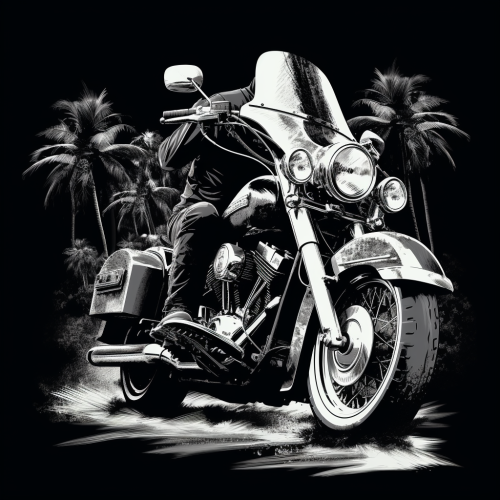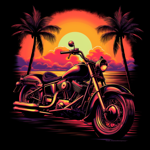 80s airbrush style artwork rock n roll style,Harley Davidson Panhead motorcycle, hotrod realistic layers stencil style drawing apparel dark t-shirt design, Hawaii, vector graphics illustration, neon - - v 5.280s retro Miami vice Motorcycle muscle car, neon lights and a view of the sun, dark atmosphere, dark synthin, the style of thriftcore, I can’t believe how beautiful that is, subdued tranquility, zigzags, princesscore, futuristic gothic, outrun - - v5.2 - - ar 7:4