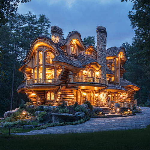 Imagine the facade of a restored historic mansion, where classic architectural elements are carefully preserved and elegantly blended with modern luxury. The original stone columns stand tall and imposing, intricately carved with renaissance-era details. The stone facade, restored to perfection, features decorative moldings around the windows and intricately designed wrought iron balconies that echo the craftsmanship of a bygone era. Large, floor-to-ceiling glass windows have been subtly integrated into parts of the facade, offering panoramic views of the landscape while flooding the interiors with natural light. The modern glass contrasts harmoniously with the classical stonework, reflecting the surrounding trees and sky. A grand entranceway is highlighted by polished marble steps leading to a stately front door, framed by bronze accents. Discreet, warm lighting is embedded within the steps, creating a luxurious pathway up to the mansion's entrance. The roof retains its classic terracotta tiles but with a modern twist--solar panels are seamlessly integrated, blending sustainability with timeless elegance. To the right of the mansion, a newly built wing stands out with minimalist design: sleek concrete walls, glass panels, and sharp lines, yet it maintains a visual harmony with the historic core of the mansion. The front garden features a classic stone fountain in the center, surrounded by meticulously trimmed topiary and lush flower beds, adding a touch of sophistication to the estate