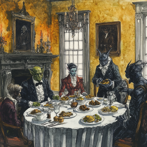 pen and ink drawing colored in with watercolors of an antebellum plantation dining room with human southern aristocrats and orc servants with hors doeuvres