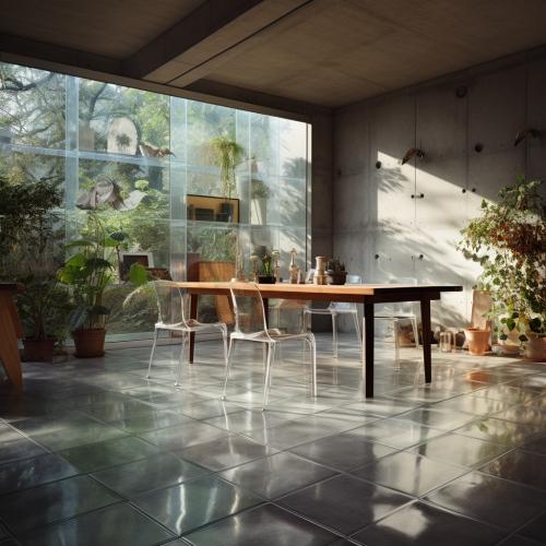 a dining room, in the style of concrete brutalism, with a two way waffle concrete slab, inspired by London Barbican Food Hall, brick tile on the floor,transparent/translucent medium, konica auto s3