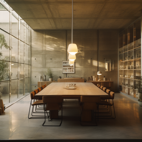 a dining room, in the style of concrete brutalism, witha two way waffle concrete slab, inspired by London Barbican Food Hall, transparent/translucent medium, konica auto s3