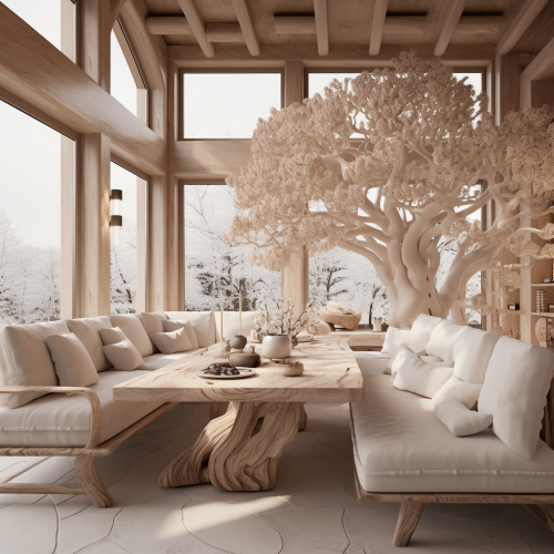living room in farmhouse in japandi style with trees inside, couch inspired by white peony flowers, light color scheme, dining table made of tree root, wooden chairs with carved details