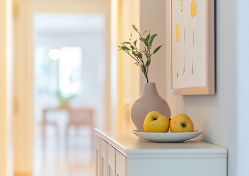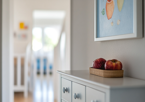Entrance hall to the house, close-up of a narrow white dresser, on the wall above the dresser there is a painting drawn by a child - in the drawing apples and honey are drawn. White living room with blurred background, daylight --ar 7:5