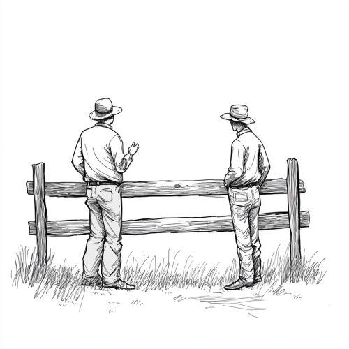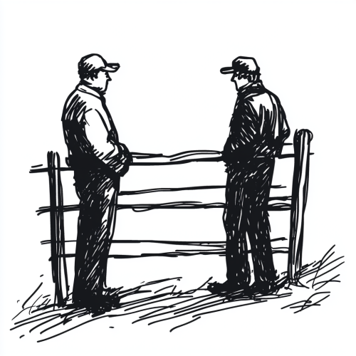 Two farmers talking over a piece of fence, side view.A minimalist comic-style child's drawing in black and white with simple line art. The drawing is primitive and lacks any background or shadows, onli contour. The overall composition is clean and uncluttered.