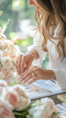 Female entrepreneur's hands arranging vision board, gold rings visible, inspirational quotes and luxury brand images, fresh flowers, pastel color palette, high-end desk accessories, soft window lighting --ar 9:16 --style raw --s 250