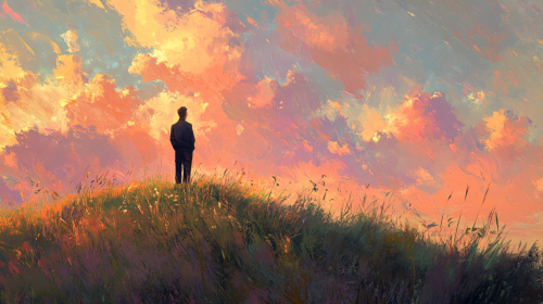 A hopeful father standing on a grassy hilltop, gazing into the distance with a gentle smile, bathed in warm, golden light. Behind him, a sky filled with soft, impressionistic clouds painted in the style of Monet, with hues of pink, orange, and lavender blending harmoniously. The scene captures a sense of peace and optimism, with soft brushstrokes and a delicate play of light and shadow. Created in the style of Monet, with emphasis on atmospheric perspective, light, and color harmony, hd quality, natural look --ar 16:9 --s 250