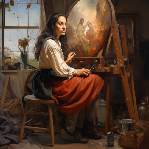 a female artist, painter, sitting on a stool, at her easel, working