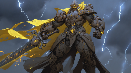 a upper body portrait shot of a man in demonic Futuristic Knight armor with yellow lightning accents and yellow lightning powers standing on top of a mountain in the middle of an intense battle --ar 16:9 --niji 5 --style expressive