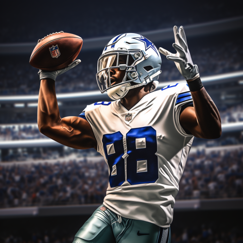 Ceedee Lamb wearing number 88 jersey on the Dallas Cowboys catching football in the endzone, An ultra-realistic photograph captured with a Sony α7 III camera. In a american football stadium with large crowd. Painted in Matejko art style