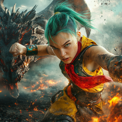 Create an image of a dynamic, action-packed scene featuring a live-action young woman with striking green hair styled in two pigtails, wearing a colorful superhero outfit with a red scarf. She is engaged in an intense battle against a fearsome dragon amidst a rocky, volcanic landscape. The dragon is massive, with scales glowing like molten lava, and it breathes fire towards the woman, who is in a dynamic pose, with one fist extended forward, her expression determined and fierce. The background is dramatic, with smoke and fiery embers filling the air, enhancing the epic nature of the confrontation.