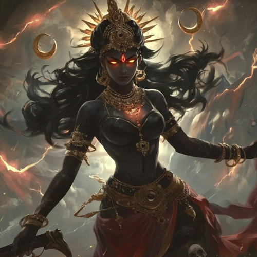 Devi Kali in her Raudra Roop, a powerful figure radiating the fury of battle and dignity of valor. Her dynamic form, crafted from the ethereal essence of divine energy and shadow, features deep, dark skin like a starless night, symbolizing chaos and transformative power. Her eyes burn with fiery crimson intensity, reflecting determination and an unyielding spirit. She wields a lethal Kalaripayattu sword, its blade flickering with ethereal flames, while adorned with a garland of skulls representing her victories over demons. Set against a stormy cosmic battlefield, with swirling mists and flashes of lightning enhancing the atmosphere, this scene is painted in a dramatic, surreal art style with vibrant colors. Soft, ambient light creates an ethereal glow around her, captured from a low angle perspective to emphasize her imposing stature. The mood conveys strength and empowerment, with intricate patterns on her skin shimmering, and her crown adorned with crescent moons reflecting her glorious conquests. The scale is grand, making her seem both majestic and fearsome, with textures ranging from the smoothness of her skin to the roughness of her sword and the intricate detail of her crown