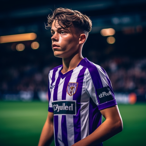 Dutch football player, 20 years old, taken with a Canon EOS R5, 300mm lens, f2.8, evening match under stadium lights, wearing purple and white striped Fiorentina jersey, running down the right flank during an intense match, determined expression, short hair, muscular build, crowd cheering in the background, action shot, dynamic posture, sharp focus on the player, full stadium as background --v 5.0 --s 800