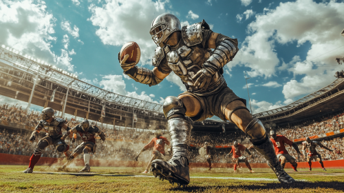 A 4k photorealistic photo of an American Football player wearing a red uniform holding in his hand lightning in a glass bottle. Dark and dramatic setting