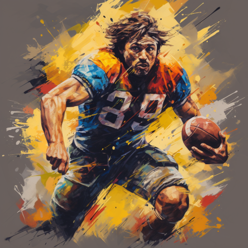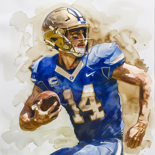 Tyler Murray, 28 years old, 6 foot 2 inches tall, quarterback, football player, looking to pass the football, ultra photo realistic, wears a gold coloured football helmet with blue stripes, #14, ryal blue color jerseys with white numbers and gold trim, blue pants, watercolor painting --v 6.0