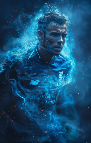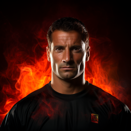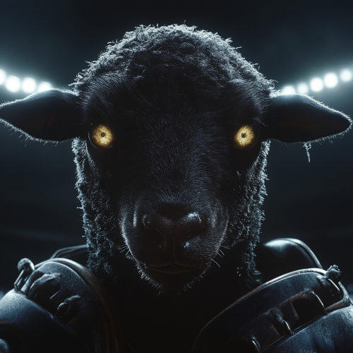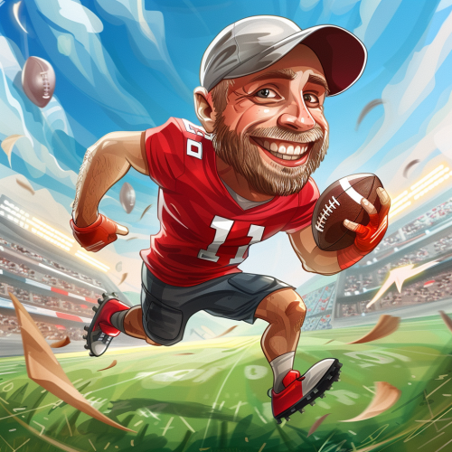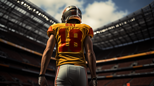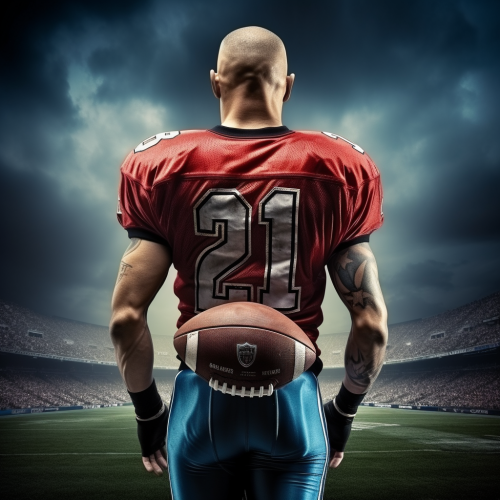 A 4k photorealistic photo of an American Football player wearing a red uniform, standing straight up, holding in his right hand a closed corked glass bottle of blue lightning. Dark and dramatic setting