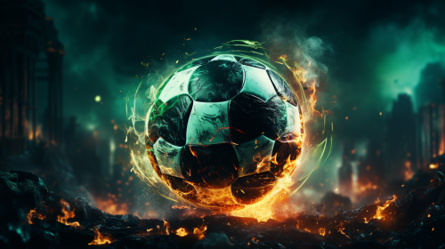 football ball on fire, background: neon lights, dark green colors. 4K, full hd, high quality --ar 16:9 --s 500