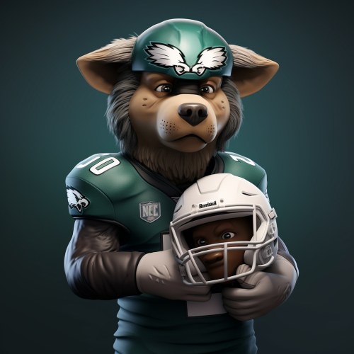 Illustrate a Big husky football player with a Dallas Cowboy jersey hold a small Philadelphia Eagles football player around the neck in a stadium 3D style