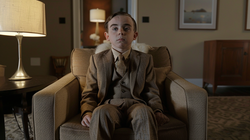 Frankie Muniz wearing a children's suit. Its way to small and doesn't fit him. He is sitting on a couch in the living room --ar 16:9