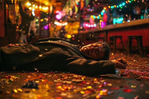 Photograph inside a late-night bar. A man in a wrinkled suit is asleep on the floor, surrounded by confetti and streamers. --ar 3:2 --v 6.0