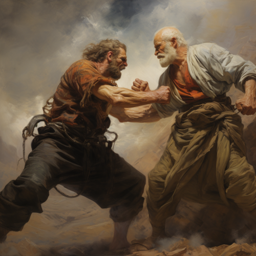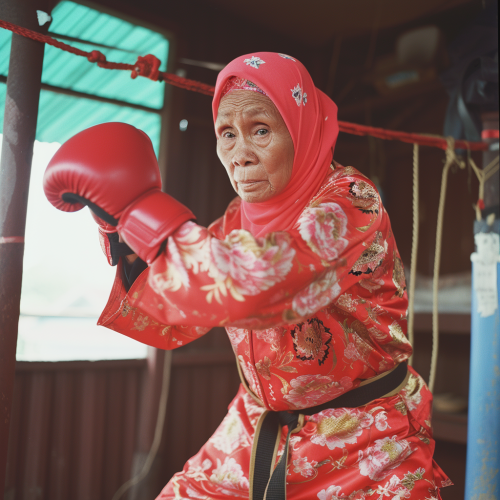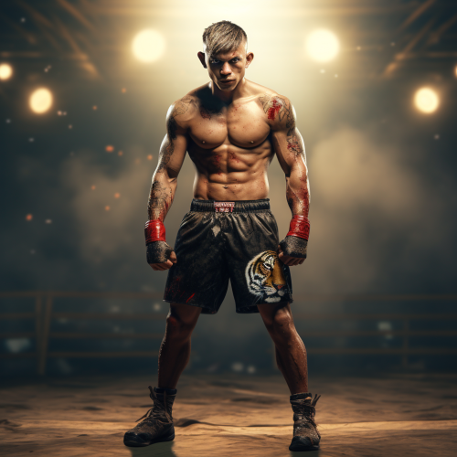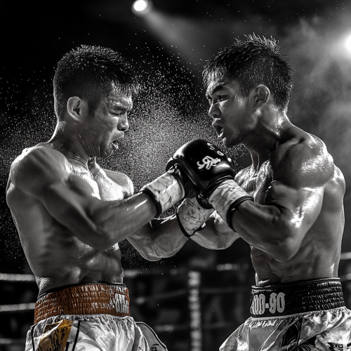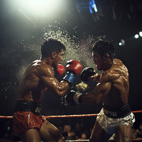 Imagine a tense Muay Thai match under the bright lights of a crowded arena. Two fighters, muscles tense and glistening with sweat, circle each other with fierce determination. Suddenly, one fighter leaps forward with explosive power, driving a flying knee into the chest of his opponent, whose face contorts with the impact. The crowd gasps as the dramatic scene unfolds, capturing the raw emotion and adrenaline of the fight,--ar 16:9 --v 6.1 --style raw