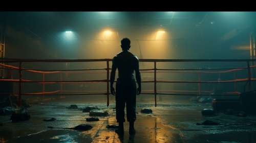 The image is a cinematic , taken with a Sony a1 using a 50mm 1.2 G Master lens, capturing a muay thai fighter from the back leaving the ring after a succesful victory --ar 16:9